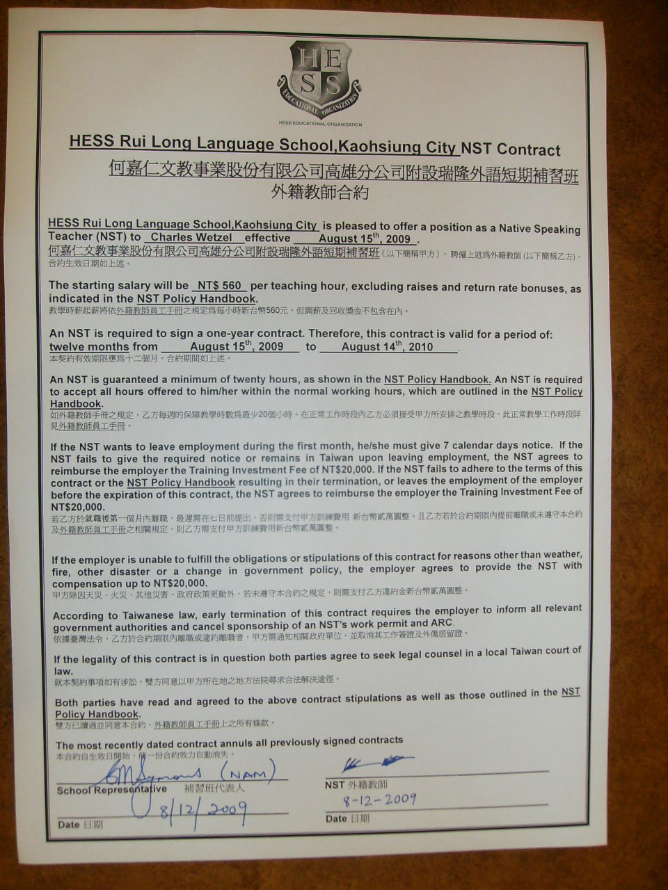 After that, I go to Kaohsiung again for my "branch training." My branch is the Ruilong branch in Kaohsiung, and our head NST (Desmond, who seems to be from a country that uses "Received Pronunciation" [maybe British or South African]). There will be further training for a few days. My first contract day (for which I'm paid) is on August 15. The first month, I'll only get 16 teaching hours a week instead of 20 while getting adjusted, but after the first month, 20 hours are guaranteed. Here is my schedule: weekdays from 5 PM to 9 PM and Saturdays 10 AM - 12 PM. This means I'll be teaching about 22 hours a week on average.