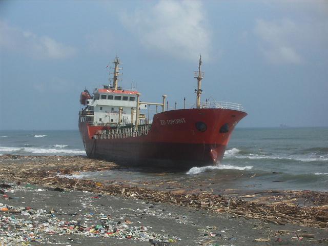 This ship has run ashore and appears to be stranded. And there's a ton of crap around it that wasn't there before.