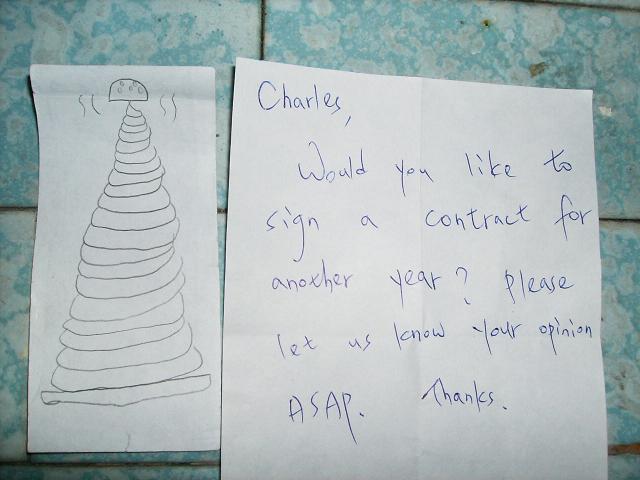 Here, we have two pieces of work-related memorabilia. On the right is a memo from my boss, asking me to re-contract! Hooray! I told her that I'm not re-contracting, but was still very flattered that she asked. Not getting fired is one thing — having the boss ask you to stay on for another year is another! On the left is a picture of a "crap hamburger," courtesy of my seven-year-old student, Queenie. I inadvertently taught her the word "crap." I was showing her a picture of crayons and asked "What are these?" and she replied in her little Queenie voice "They are crap." I said (in Chinese), "No, Queenie, that word means 'poop.'" Please note that I did not even repeat the word "crap" back to her. However, a few minutes later, I visited her desk again, and found a picture similar to this one drawn in pencil in her book. I asked "Queenie, what is this?" She said "It's a crap hamburger!" Wow, she sure picked that one up fast... She drew this picture for me later on on the back of a piece of in-classroom money...