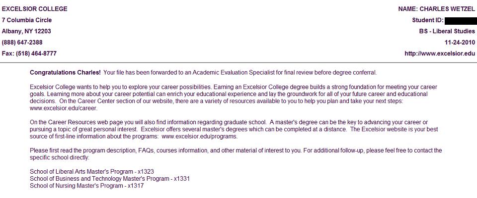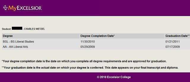 Excelsior College has now conducted its official "final review before degree conferral." Please note that the date of 11/30 is when they considered me "complete," but I actually completed the degree (as in taking the final exam) on 10/23/2010.