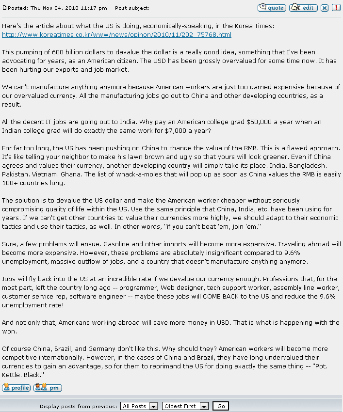 For quite a while, I have been in favor of devaluing the US dollar to increase America's competitiveness. Finally, today, it was announced that the government is pumping $600 billion into the economy to devalue the currency. I wrote a post on Dave's ESL Cafe about it, which I captured using screen capture and will post right here: