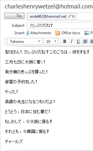 ![]() | Translation: Recipient: Hwangdae (my friend in Osaka, a Zainichi Korean) Subject: It has been a long time, hasn't it? Mr. Hwangdae! It has been a long time, hasn't it? What have you been doing recently? I'M GOING TO ARRIVE IN OSAKA ON MARCH 7! I BOUGHT MY PLANE TICKET! I MADE MY ROOM RESERVATIONS! I DID IT! I am planning to become an English teacher, for sure! Finally, it is my dream to live in Japan! Are you, perhaps, in Osaka now? Or are you in Korea now? Charles |