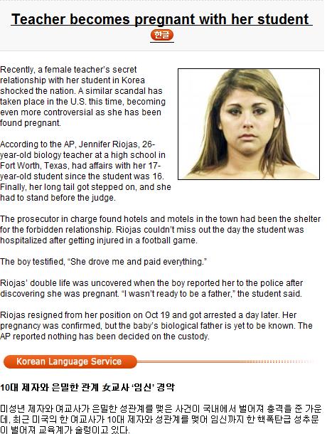 Enter Jennifer Riojas, the teacher is is supposedly "pregnant with her student." So, for those of us who can actually speak English, what this means is that she is somehow carrying her student inside her belly! In proper English, we would say she is "pregnant by her student," but hey, this is the Korea Times, anything goes.