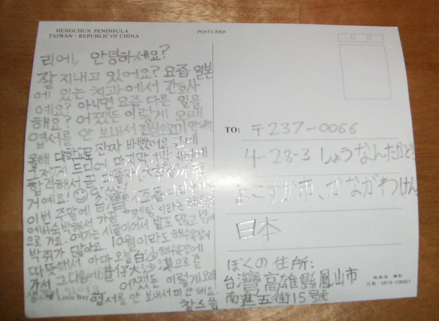 This is the postcard I sent to my friend in Japan. Since it's in Korean and the readers of this site generally don't speak Korean, I consider the privacy of all parties sufficiently protected. :-)