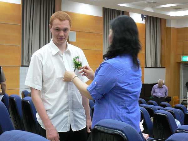 | The Graduation Hall on the Morning of, Early, Before the People Came | Teacher Park Pinning the Flowers onto My Shirt Prior to the Graduation Ceremony |  |  | | Me and Three Classmates (already named above) | Lower Grade Photo of Our Class (with me looking slightly more irritated) |  |  | Another Picture of Our Class (the woman second from the right, not present in any previous pictures, is Mira, from Kyrgyzstan) Special thanks to Mira, from Kyrgyzstan, for sending me this picture. I had my own of the exact same thing, but her camera is MUCH higher quality. | Our class met at 5:00 PM on Graduation Day to have dinner. Then our teacher had to go home (or more like leave us to our own revelrous devices) and we went to a barbecue place and a bar, and in the process consumed copious amounts of alcohol and played Spin the Pen and learned many FASCINATING facts about each other. Special thanks to Mira, from Kyrgyzstan, for sending me this picture. I had my own of the exact same thing, but her camera is MUCH higher quality. |