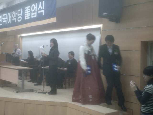This is a picture from the Level 6 Graduation Ceremony. Unfortunately, I was unable to catch my friend, Akiko, graduating, but here's a picture of some people that I DON'T know, graduating. Girls generally wear hanboks. Fortunately, guys don't seem to be required to do this (I'd have trouble finding a hanbok in my size, anyway).