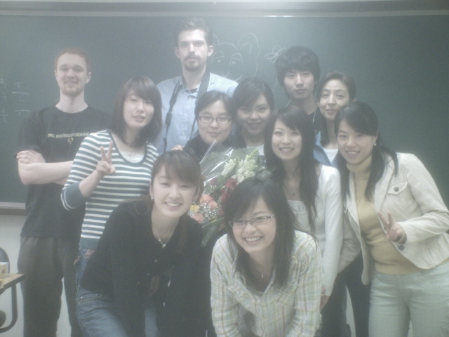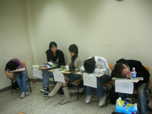 Level 2 This is my Level 2 class right after midterms (picture sent to me by Jeongja, thanks). Top Row (from left to right): Iting, Gwanso, Toshie, Teacher Yi, Chunmae, Kazumi, Jeongja Bottom Row (from left to right): Me, Yusuke, Kyung Won, Eric, Yeja The Asian school systems force students to study late into the night, causing burnout. Oh wait, that's my class!