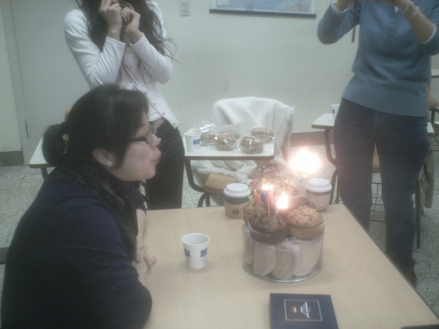 This is Mrs. Jeong blowing out the candles on her birthday cake, on her birthday, which was coincidentally also the last day of school.