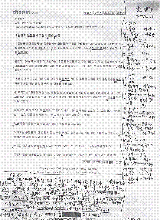 So I don't forget my classmates' names (I hope I haven't already): Left Side (from front to back): Sora, Johnny, James Forrest (CELTA Instructor), Euna, and some dude Right Side (from front to back): David, Tania, Me, Andrew Prosser (CELTA Instructor), Richard Level 4 In Level 4, we pick out newspaper articles, find all the unknown words (underlined), write a summary, write our opinions, write two questions for the class, and then write something to discuss with the class. In this case, I picked an article about a 180-kilogram gorilla that went on a rampage at a zoo. We have to make little handouts like this and give them to the class before the presentation so everyone can (supposedly) study them, though I don't think anyone ever does. Chosun Ilbo is regarded as the hardest newspaper in Korea in terms of literacy required, but this article didn't seem that bad. This is Rena, Sonmyeong, Me, and Jangok at a Samgyeopsal place. Rena is an airline stewardess. Sonmyeong is some sort of a computer geek. I'm me. Jangok is approximately my same age, and might possibly wear the same shirt every day (yet doesn't seem to smell), but he's cool.