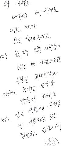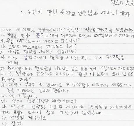 Here's a Sanghwang Yeokhal that me and Dane are doing for the final exam. | Cheolsu: Ah, Teacher Baek, hello. As far as I knew, you had retired (we originally wanted "as far as I knew, you had died of old age," but the teacher didn't approve). Teacher Baek: Cheolsu, hello. Instead of teaching at middle school I teach at a university. Cheolsu: At which university are you teaching? Teacher Baek: I am teaching at Korea University. Cheolsu: Are you still teaching philosophy? Teacher Baek: No, at the middle school, I taught philosophy, but now I teach Korean language. Cheolsu: Congratulations. Teaching Korean language is difficult. It must be interesting. Teacher Baek: Yes, teaching Korean language is by far more worthwhile than philosophy. How about you, what do you do? Cheolsu: I tested well on the university entrance exam but I hated student life so I became a farmer that grows mandarin oranges on Jeju Island. Teacher Baek: Oh, I see. Cheolsu: When do you plan to retire? Teacher Baek: I plan to teach Korean language forever. Teaching Korean is so worthwhile that I will never quit. Cheolsu: Bye. Teacher: Bye. |