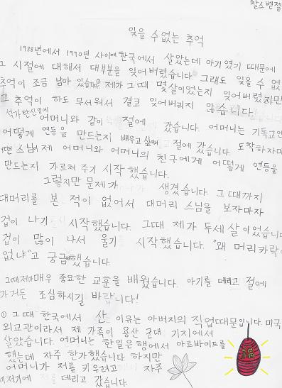 Here's my "Sam-bun Iyagi," or "3-Minute Story." It's about seeing bald monks when I was a toddler and how they scared the crap out of me. The reason for the picture of the lotus and the lamp at the bottom of the page was that I was trying to find out from Mijung how to say "lantern" without asking her in English. The word is "yeondeung."