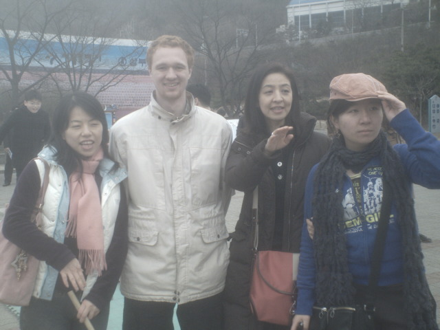 This picture was taken during the second semester of Level 7, but is of me, Teacher Jeon, and some of our old classmates that we rounded up around campus. From left to right, there's me, Yongdan, Gimhye (they both look almost like twins, so I'm not sure who is who, actually), Teacher Jeon, and Gayeong (Jia Ling). All are Chinese except me and the teacher.