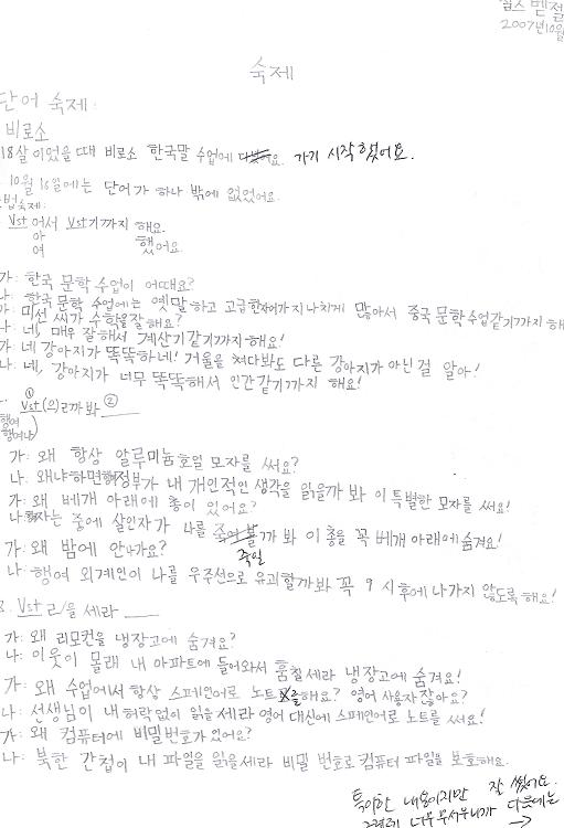 Level 5 This is my Level 5 class at lunch. Unfortunately, not everyone in our class could be present for this picture. Front: Me (US), Andrew Kim (US) Back: Saehan (Mongolia), Sakai (Japan), Gahaedo (China), Gangtulga (Mongolia, possibly Gangtolga, as he spelled it on the e-mail contact sheet) | This is some sample homework that I did. I chose this one because I thought the content was extra "special" and I think my teacher agreed, so she wrote a little note (I think she was afraid I'd become another Cho Seung-Hui/Virginia Tech incident)! Charles Wetzel October 16, 2007 HomeworkWord Homework: 1. For the first time When I was 18, I started going to Korean class for the first time. On October 16, there was only one word [to do for homework]. Grammar Homework: 1. Vst (Verb stem)eo/a/yeoseo Vstgiggaji haeyo (this grammar means "it is to the point where"). A: How is the Korean literature class? B: In the Korean literature class, archaic expressions and high-level Chinese character words are too abundant, so it's to the point of being like a Chinese literature class! A: Does Miseon do math well? B: Yes, [Miseon] does it so well, it's to the point where [Miseon] is like a calculator! A: Your puppy is smart! Even though he stares at a mirror, he knows that it's not another dog! B: Yes, my puppy is too smart, so it's to the point where he's like a human being! 2. (1) Vstlgga bwa (2) ____ (Haengyeo Haengyeona) (this grammar means "because I am concerned that possibly ____, I ____." A: Why do you always wear an aluminum foil hat? B: Because I am concerned that possibly the government will read my personal thoughts, so I wear this special hat! A: Why is there a gun under your pillow? B: I'm concerned that possibly, while I'm sleeping, a murderer will kill me, so I hide this gun under my pillow without fail! A: Why don't you go out at night? B: I am concerned that possibly space aliens will abduct me with their spaceship, so I DO NOT GO OUT after 9:00, without fail! 3. Vstl/eul sera ____ (this grammar also has the meaning of "I am concerned that ____, so ____") A: Why do you hide the remote control in the refrigerator? B: I am concerned that the neighbors will secretly enter my apartment and steal it, so I hide it in the refrigerator! A: Why do you always take your notes in Spanish, in class? B: I am concerned that the teacher will read them without my permission, so instead of English, I write my notes in Spanish! A: Why is there a secret password on your computer? B: I am concerned that a North Korean spy will read my files, so I protect my computer files with a secret password. |  | The Teacher's Note: It's "special" content, but you wrote well. However, because it's too scary, next time, please write content that is not scary. Because it's homework that I see, like this. Because it is like that, do sentences that usual people write, [that are] natural, and after that, please try to make "special" sentences. I want to confirm that you can use the grammar well in the correct situations Thank you (a version of "thank you" usually said after someone has done a lot of work) |