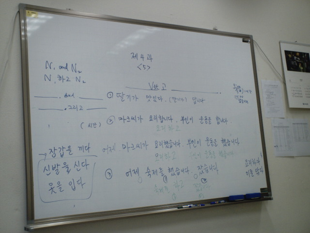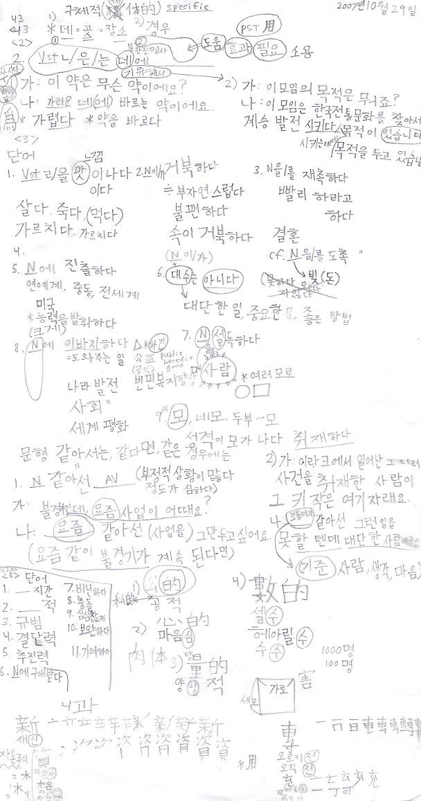 Okay, I must criticize the Yonsei program for the insane board work. This is basically a carbon copy of the board, and we're supposed to copy these things down so we know what to do for homework, etc. On this particularly frenetic day, I took TWO pages of notes -- the other one was just as crazy as this one. The board work is disorderly, and there's just too much of it. My CELTA teacher would have had a fit. I chose this particular set of notes because it also includes notes for my Chinese characters (hanja) class.