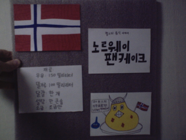 Norwegian Pancake Project Yes, I gave a short talk on Norwegian pancakes. Now Korea knows about them. If you look closely next to the big, yellow personified Norwegian pancake, you'll notice a little blue thing. That's a Dragon Quest slime (Dragon Quest is a role-playing game that is popular in Japan). I heard a rumor that all Japanese people know about slimes, so I figured "my class has a ton of Japanese people, so I'll slip one in and see if anyone notices. If the teacher asks, I can say it's 'blueberry jam.'" Anyways, I gave my talk, and no one seemed to notice. It bothered me that this rumor appeared to be a complete fallacy, and I was tempted to make posts on RPGamer discrediting it. However, I asked Kyungwon, and he said "Dragon Quest slime." Okay, so he got it, but I had to ask him. Later, as I was walking down the street with my Japanese buddies, Jungja (she goes by her Korean name) said something like "wasn't that a slime?" Okay, so two people got it. I asked her if she thought any other students had gotten it. She said that she was pretty sure that at least Yeja (Yoshiko) had gotten it, too. Slime Rumor Verdict: True