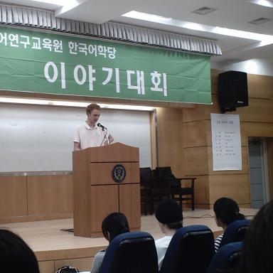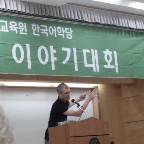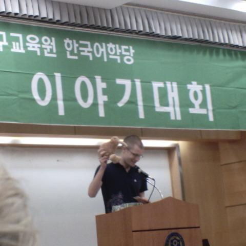 The Speech Contest There's me, giving my speech in front of hundreds of people, in Korean. Would you be intimidated? There's Mark, my classmate, giving a dynamite speech about the three meanings of the word "kiwi" (which is coincidentally also "kiwi" in Korean).