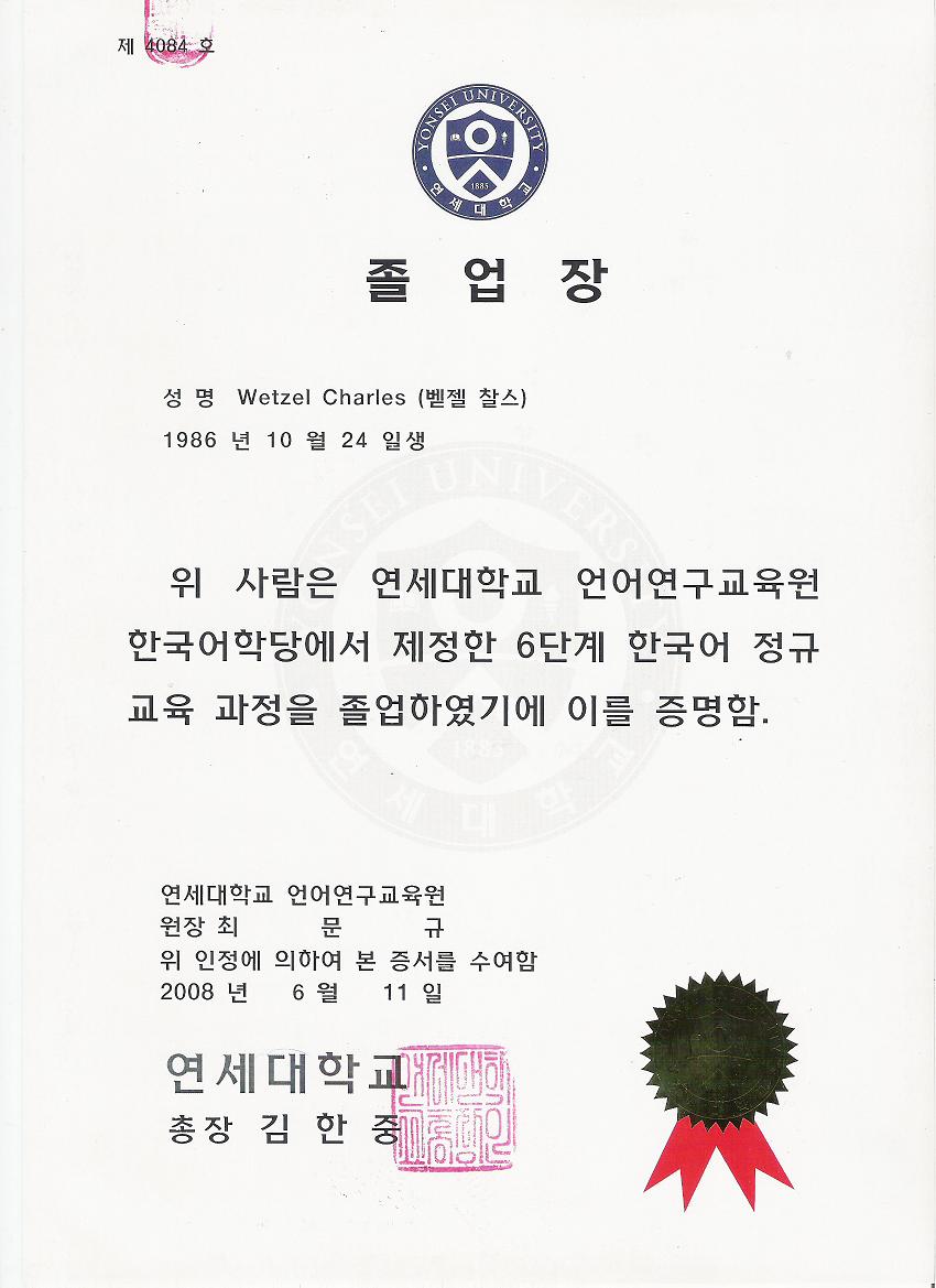 If I manage to follow that insane test schedule (believe me, it may not look hard, but it will be) then I'll be merrily on my way to Taiwan with an associate's degree by September. June 8, 2008 I didn't have much time in Japan (Izuhara, Tsushima) so I basically just found a minshuku (cheap hotel) and ate. I tried to set up a bank account (because I heard it takes six months, so I figured I'd get started early) but the bank told me that I can't set one up unless I have a job in Japan, but once it's set up, it only takes 10 minutes until you can use it. So I didn't get it set up, but at least it sounds like it won't be a huge hassle in the future -- unless they didn't know what they were talking about, which is always possible. For the third time in the last year, I was struck with how much BETTER Japan seems than Korea. People are polite and don't try to get on your case, yell at you, make fun of the way a foreigner talks, etc. Right after coming back to Korea I started experiencing that shit all over again and remembered what an abrasive country this is. Well, no doubt the nationalistic Korean-American is saying "if you don't like it, then leave." Well, that would be somewhat unwise with my graduation from Yonsei just around the corner, but soon after that, I plan to get the hell out of here and go to Taiwan. I'm not qualified to work in Japan yet (that'll come next) but at least in Taiwan people aren't having a so-called "peaceful candlelit vigil" against the US in which they rip the armor off of armored police buses and firebomb the interiors (then complain excessively when the police respond in self defense with water cannons). Sure, there are western guys who, despite the anti-white hatred and overall xenophobia in this country, still manage to love it. I'm just curious, though, have those guys ever lived in another Asian country? I have a feeling it's a frog in the well type of thing. Guys come here and say "this is great, I can go to internet cafes whenever I want, the language is cool, and the women are all so attractive." The thing is, you can get that in ANY East Asian country, not just Korea. Some guys come to Korea, decide they love Asia, and then assume that these things must just be Korean. Little do they know, there are other Asian countries out there too with all the good things of Korea -- and with 75% less bigotry! Man, I wish I could live in Japan. Just another year and four months or so of perseverance (until I'm well-qualified enough to get the work visa) and it can become a reality. June 5, 2008 I got my final test grades back. I found out my grade for Level 6 (75% [C] ![]() <- I INCREASED MY LISTENING SCORE BY MORE THAN 30 POINTS OVER MIDTERMS! HOLY SHIT!![]() (composed of a research paper: 24.5/30 and a test: 53/70)Well, I'd better pack for Japan now. Maybe I'll update again from Busan. June 4, 2008 BARRING AN EXTREMELY UNLIKELY EVENT, I WILL GRADUATE FROM YONSEI UNIVERSITY KOREAN LANGUAGE INSTITUTE!Today I took my reading test. She graded it on the spot and I got 71%. This averages with my midterm reading exam (55%) to make 63%. Yahoo! I passed reading by a 3% margin! As for listening, I don't know what I got on the final, but it must have been at least a 62%, because the teacher said she calculated my average listening score for the term and it exceeded 60%. I haven't gotten back my speaking or writing results yet, but since I had more than 80% on each one of those at midterms, I would need to literally get less than 40% to fail either one of them.My attendance currently stands at 166 hours (you must attend 160 hours of class out of 200 to pass). So I pass in that respect. Unless something catastrophic and bizarre happens, like my teacher inaccurately reporting my listening test score, or deciding that she hates me and giving me a 0% participation grade, I'll pass the class and graduate from Yonsei University Korean Language Institute. So now I can just sit back and relax. Oh wait, I can't. I have to go to Japan tomorrow. Oh well. I hope I got at least a C this term, but if I didn't, just graduating will satisfy me. I am so ecstatic right now. I stayed up all of last night and didn't get a minute of sleep, and if I hadn't done that, well, since I passed it by a mere 6% margin, it seems unlikely that I would have passed it had I not studied that hard. Today has become a very good day. I celebrated by eating McDonald's, watching American TV, and taking a nice, long nap. Graduation day is on June 11. Then I'm a free man, free to go to any country I'm able to go to, free to study the things I want to (admittedly I got a bit sick of studying Korean), etc. I'm going to try to knock out my associate's degree over the next seven weeks, then after that, start studying Information Technology full-time (my major for my bachelor's degree), while continuing to live in Asia (though not necessarily Korea). June 3, 2008: UPDATE 2 For the writing test, I don't even need a 40% on the final to pass, so I'm not too concerned about it (because I did well on the writing midterm). Listening is a different story. I need a 62% this time. I got a 58% last time. I truly have no idea if I reached my target or not. It was, just like the midterm, one hell of a test that few people found easy. I guess the Yonsei KLI doesn't care if seven people in our class of 12 fail. Since the finals for writing and listening have been anything but easy, I see no reason to expect the reading final to be easy, either, so I'd better prepare with everything I've got, even though I really don't want to study right now (in too much agony about whether I passed listening). I mean, I could have already failed the class based on my listening scores, so the hours of study I'm about to do could be for diddly squat. Deciding to take a break from the testing hell, I got two bacon cheeseburgers and some fries from McDonald's and turned on the TV and watched an English channel. Saw "A Cinderella Story." What a bad movie. 