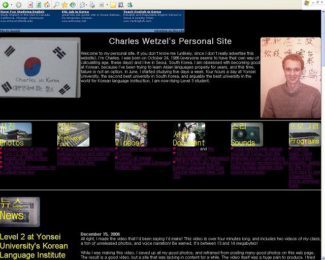 May 26, 2008 When I went to Robinson Secondary School in Fairfax, Virginia (2001-2005) I knew this Korean guy named Charles Yang. We were in the same Pre-IB Geometry and IB Physics classes. I hadn't seen him since 2004. I was just adding a bunch of people that I'd known from before on Facebook. This morning, I got the notification that Charles Yang had added me. And sent me a message: "Woah long time. This is so weird but I think I saw you in ���� [Gangnam] two saturdays ago. Anyways its pretty cool that you are going to Yonsei. I was there two years ago. Maybe i'll cya around." HOLY SHIT! What are the chances of running into someone you knew from high school on the other side of the world, without having planned it, just in public like that? It's a Festivus Miracle! It's also occurred to me that I don't have much time left until the finals begin. So here's the new study plan for the next eight days: If I do all these things, I should be as prepared as can be expected for the final reading test. I need a 65% on that to pass the class. I think it's POSSIBLE if I know the story really, really well, as well as all the practice paragraphs, and 90%+ of the words we've learned this term. Reviewing the listening comprehension practice and practicing by listening to the radio/TV is about all I can realistically do to prepare for the listening test, but I'm not as afraid of that because it will have to be easy for the class to pass it. Remember, in our class of 12, seven people failed the listening test, so either they make it easier than last time, or nearly everybody is going to fail. The speaking and writing tests should be no problem. Basically, I'd like to get at least a 70% this term, but if I am only in the 60s, it's not the end of the world. I'll still have my graduation certificate from Yonsei University Korean Language Institute, the only difference it'll make is slightly more work that I need to do for my bachelor's degree (since I'll be missing six credits) and I won't be able to double major (in IT and Area Studies: East Asia), only single major (in IT only, which is actually the only useful major anyway for employment purposes).