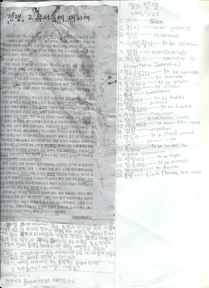 March 1, 2009: UPDATE 2 In other programming news, yesterday, Mijung Song memorized all 46 katakana using my NihonGO! Japanese quiz program (she emulated it on her PC with TI-83 Plus Flash Debugger). I'm not kidding, in just a few hours, the 41-year-old Korean businesswoman learned 46 Japanese symbols that she had not learned before. Although this is a testament to the usefulness of the program I wrote, I cannot take all the credit -- she knows approximately 3,500 Chinese characters, and therefore has a very good memory and the katakana, in many cases, look similar to Chinese characters (for example, her mnemonic for learning chi in hiragana is that it looks like the character cheon, or 1,000, in Chinese characters). March 1, 2009 Some people have already suggested that this is a ripoff, that I could just find a job in China with the same or better wages, and that I'm handing someone my money for a useless TEFL certification (especially since I have CELTA). However, I think my idea makes sense, because I still do not really have a clue how to teach children, which this course will offer. Plus, if I went to China and job hunted for a month, I bet my expenses would be several hundred dollars -- this program saves me those expenses by guaranteeing me a job. So if you combine the training in teaching kids, the included lodging in Beijing, and the removal of the hassle of having to find a job myself, it actually seems like a decent deal. If I do this, I will enter China on approximately June 14. Though this stint in Korea will have lasted just a few days short of three years, I actually spent more than two years here when I was a kid, and so the sum is still over five years. I think this plan is safer than going to Ireland right now. I will leave Korea with a guaranteed job in the next country. If I go to Ireland, who knows, with the bad economy, I might not be able to find enough work. I think it's better to save going to Ireland until I can be sure that I have enough money to take a big financial risk like that. Maybe in a year and a half, the economy will be better there, and I can find more work than if I went this summer. So for that reason, I'd prefer to shuffle China around to being first, then fit Ireland in with whatever time's left. The American TESOL Institute, it seems, will place me in Beijing. Really, my goals are just to make money and finish most of my university courses. I may take a semester off from my university courses to study Chinese, because I would like to bring my Chinese to an "activatable" level. In other words, I have no interest in becoming anything more than intermediate-low in Chinese right now, but I would like to be a step ahead of the pack, just in case. February 28, 2009 The squid is entertainingly labeled in Korean in the following fashion: the first pack is called "Short Legs Squid" (¼ô´Ù¸® ¿À¡¾î) and is a sort of moist, not-too-chewy variety, and the second pack is called "¿À¡¾î´Â ¶¥ÄáÀ» ÁÁ¾ÆÇØ" ("Squid Love Peanuts") and is of the more traditional dried variety. I finally solved a mystery today. A third grader that I know, Nahyeon, got eyelid surgery, and I was like "What the hell, I knew Koreans had tons of plastic surgery, but isn't third grade a bit too young?" Her mother insisted it was for health reasons, but I'm so cynical about this country, I figured those were just excuses. However, fortunately, my Korean teacher backed up Nahyeon's mother -- apparently some Koreans have lower eyelids that protrude too much and it can somehow actually "stab" part of the eye, and cause infection! Therefore, according to Mrs. Jeon, my Korean teacher, this procedure is actually fully covered by Korean health insurance. Some women have the procedure in conjunction with upper eyelid beautification surgery, but the latter part is not covered by insurance, at least in theory. However, some women will make up excuses about how their upper eyelid is "so uncomfortable" and so forth to get the insurance to cover the beautification surgery as well, although this is often illegitimate. Anyways, this helps explain why Korea's eyelid surgery level is extremely high -- there is actually a very legitimate health reason for the surgery, making this type of surgery, in my mind, equivalent to circumcision -- a theoretically unnecassary procedure, but one that makes certain functional aspects of life QUITE A BIT easier. February 26, 2009 Today in class, we watched "¾Æ³»°¡ °áÈ¥Çß´Ù" ("My Wife Got Married"). I really didn't like it very much, it put me in a bad mood, but I can't say it was that bad, because it brought up issues of paternal rights and the crumbling institution of marriage that were quite valid. What an awful wife -- she has an affair before and during the marriage, somehow convinces her husband to allow her to marry this other man in a different locality illegally (so she has two husbands) and they have her on different nights of the week. And then when her original husband has a paternity test to see if their new baby is his, she flips out and runs away to Spain. What a terrible wife, seriously. However, when I got home, my mood improved, because Yeongju was in the kitchen, and we chatted for a while, and she's an amusing person and at the end she said "thanks to talking to you, I feel that I have gotten brighter and warmer" (translated from Korean). She used to be a piano instructor, but injured her hand and can now only play as a hobby, not professionally. She apparently is having a feud with her mom and moved into this goshiwon because of it. She said she hadn't really been able to talk to anyone about this, which is a small wonder. You can't talk about problems with your parents with other Koreans, because Koreans see poor parent-child relationships and think "poor filial daughter" or "poor filial son," and assume it's the kid's fault. So that she could talk to me and get a weight off her chest without all the criticism