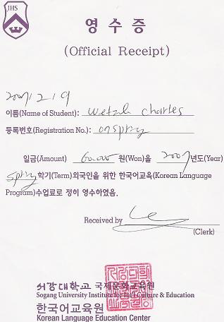 ![]() Here's the receipt that I got for registering at Sogang, yesterday. I would have posted it yesterday, but PEOPLE WERE ON THE COMPUTER NON-STOP. | February 10, 2007 Today, the site was visited by Joint Intelligence Center Pacific/RDON. I don't know why I'm getting all these visits from these threatening-sounding agencies. I just want to let you guys know that if you're scoping my site out, there are more confidential ways to do it than from a computer marked "Joint Intelligence Center!" I'm trying to study for about eight hours today. I'm behind on my vocabulary and my listening comprehension tapes (especially the tapes). Yonsei's listening comprehension tapes are HORRIBLE. It's not really clear what you're supposed to do with them, so I just type out everything they say. This usually takes about three hours per one-hour tape, and I have several tapes. Supposedly Sogang and Kyunghee have more comprehensible CDs (come on, who even uses tapes anymore). I guess I'll find out soon. Even though I'll probably end up repeating Level 3, it'd just make me feel messy if I hadn't learned as much of the material as is considered reasonable. |