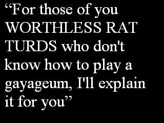![]() ![]() | February 1, 2007 Today, instead of doing third and fourth periods, we went to have a "cultural experience" ("munhwa cheheom"). We went to a place with traditional Korean musical instruments ("gugak akgi"). I don't think I've discovered a new hobby or anything, but it was still somewhat interesting. I chose the gayageum (traditional Korean drum with two sides -- one that you usually beat with a drumstick and one that you usually beat with a reed). For those of you WORTHLESS RAT TURDS who don't know how to play a gayageum, I'll explain it for you: Try reading this piece of music for practice: