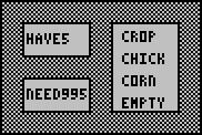 Click here to download Farming! (5 kilobytes zipped). Instructions: | Farming! (TI-83 [TI-BASIC], 2000) I wrote this game as a seventh grader, in 2000. Prior to Farming!, I had never been able to focus my attention onto one programming project to the extent necessary to create a finished game. This was a major milestone for me. In Farming!, you play a farmer who needs to raise $1,000 (you start out with only $100). You can accomplish this by buying crops and livestock, presumably growing/raising them, and then selling them. Alternatively, you can go to the hog races and bet on pigs. The only thing impeding your success is "the Feds." They visit whenever they like (sometimes twice or more in a row), and take 50% of your money! You can choose to evade them, but you may suffer the consequences. Another random event, the "County Fair," can occur, which will give you a chance to win $100, if you own a cow to show at the fair. This game has lots of other options, some of which are not essential to completing the game (there is a bank where you can view your assets, and a bar where you can get tips from other farmers). This is definitely not the best game ever made, or even the best TI-83 game ever made. However, consider the age at which I programmed it (I was probably about 13). |