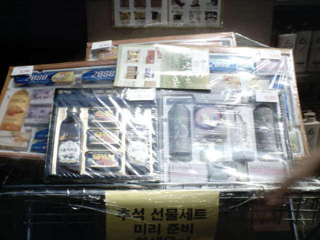 I took this picture at 7-Eleven. Apparently, SPAM is everywhere around Chuseok time. In case a gift set of two olive oil bottles and three cans of SPAM isn't classy enough, you can get your loved one a gift set of nine cans of SPAM, for about $26.