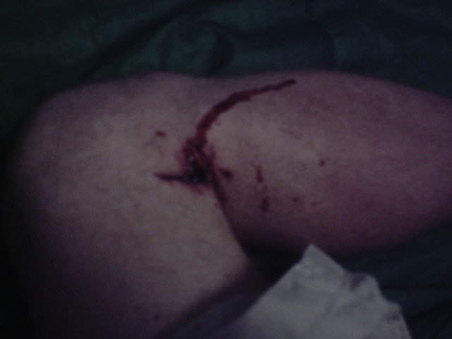 Wow, take a look at that wound! I was trying to kill a mosquito in the bathroom, I brushed against the mirror, and it shattered into a million pieces. I hope the old wives' tale isn't true. When it happened, my leg looked like a barber's pole. This picture was taken later, after I had cleaned it up, but after it had started bleeding again for some reason. I bet that'll leave a scar!