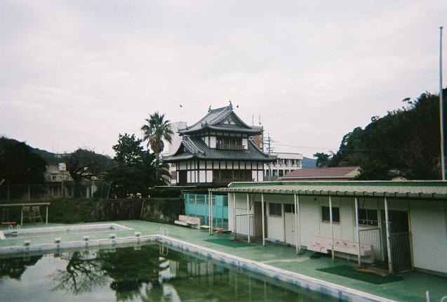 Kaneishi-jo's Reconstructed Gate | To the left, you can see Kaneishi-jo's main gate, located very close to Goryeomun. It was not clear from the sign at Kaneishi-jo's gate when Kaneishi-jo was built, but it did state that the castle was destroyed during internal fighting in 1528. It was rebuilt several times throughout Japanese history (including a major overhaul in 1669 when Yoshizane added turrets, etc). It did not have a donjon, but was apparently a formidable castle nonetheless! It was last rebuilt in 1990, though unfortunately most of what used to be the interior of the castle has been used for other purposes (like a run-down swimming pool, as you will see in the next picture). It has been known as "Fujo" ("Tsushima Lord's Castle"). |